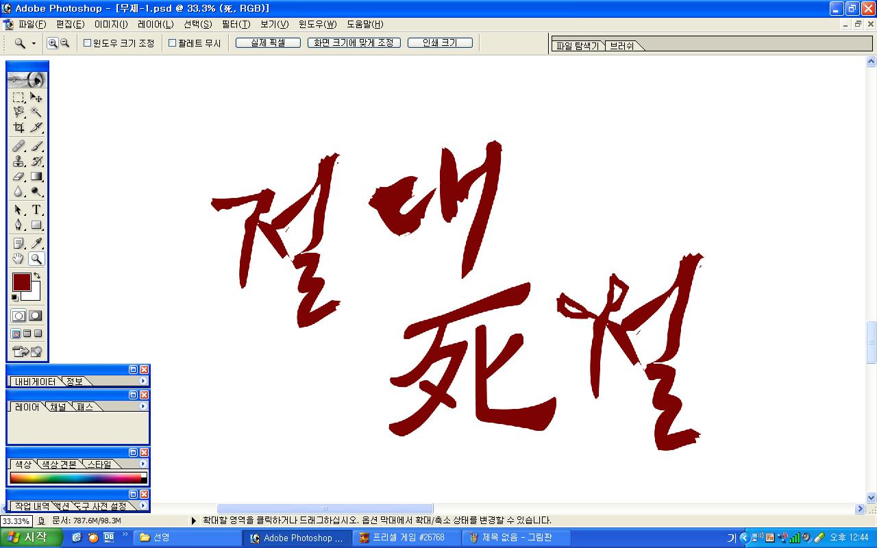 정중히 캘리 부탁드립니다. -_- 류재철 일반 0 5828 2009.11.16 11:18 실력자 분들이 많이 계셔서 이렇게 염치없게 부탁드립니다. - 절대死절 : 첨부한 파일 참고해주시면 감사하겠습니다.(약간 거친느낌? ^^;;) : '절'자의 ㅈ은 가위로...^^;; : 포스터 제작용이라 ai 파일이 필요합니다. 대학동아리 연극공연 포스터로 쓸 예정입니다. 비상업적인 공연이라 이렇게 부탁드립니다.